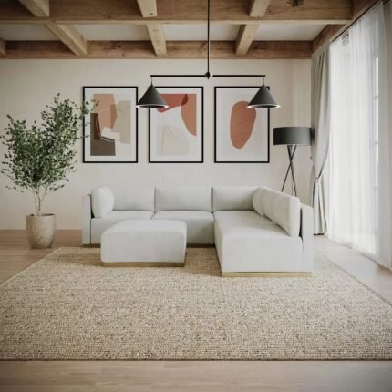 Description: This U-shaped sofa features a simple and practical design, suitable for everyday use and complementing most home décor styles. Features: – High-density foam for comfortable seating. – Practical linen fabric. Specifications: – Materials: Wood + Foam + Fabric + Linen – Color: Beige – Length: 210 cm – Width: 350 cm – Depth: 100 cm Care: Gently clean with a soft cloth and avoid harsh chemicals.