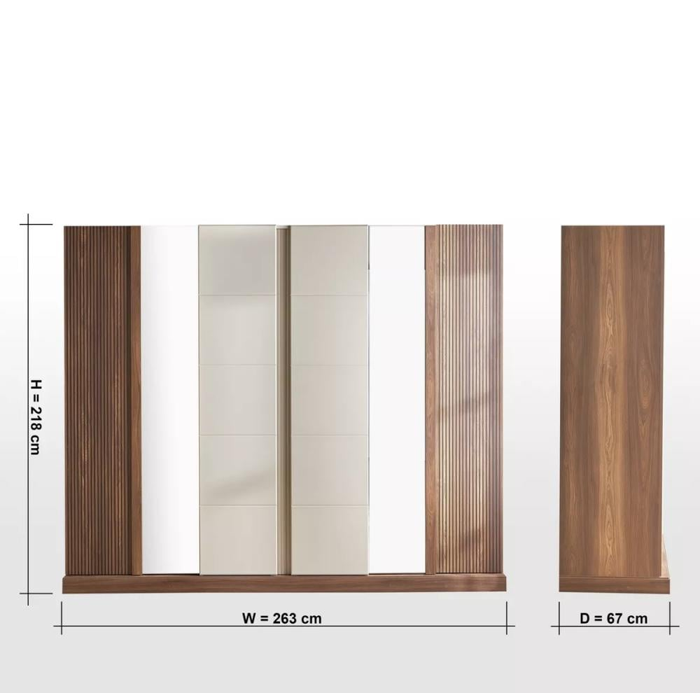 Description: The Paula 6-door wardrobe with drawers features a simple and practical design, suitable for everyday use and complementing most home décor styles. Specifications: – Materials: Wood + Fabric – Width: 263 cm – Depth: 67 cm – Height: 218 cm Care: Gently clean with a soft cloth and avoid harsh chemicals.
