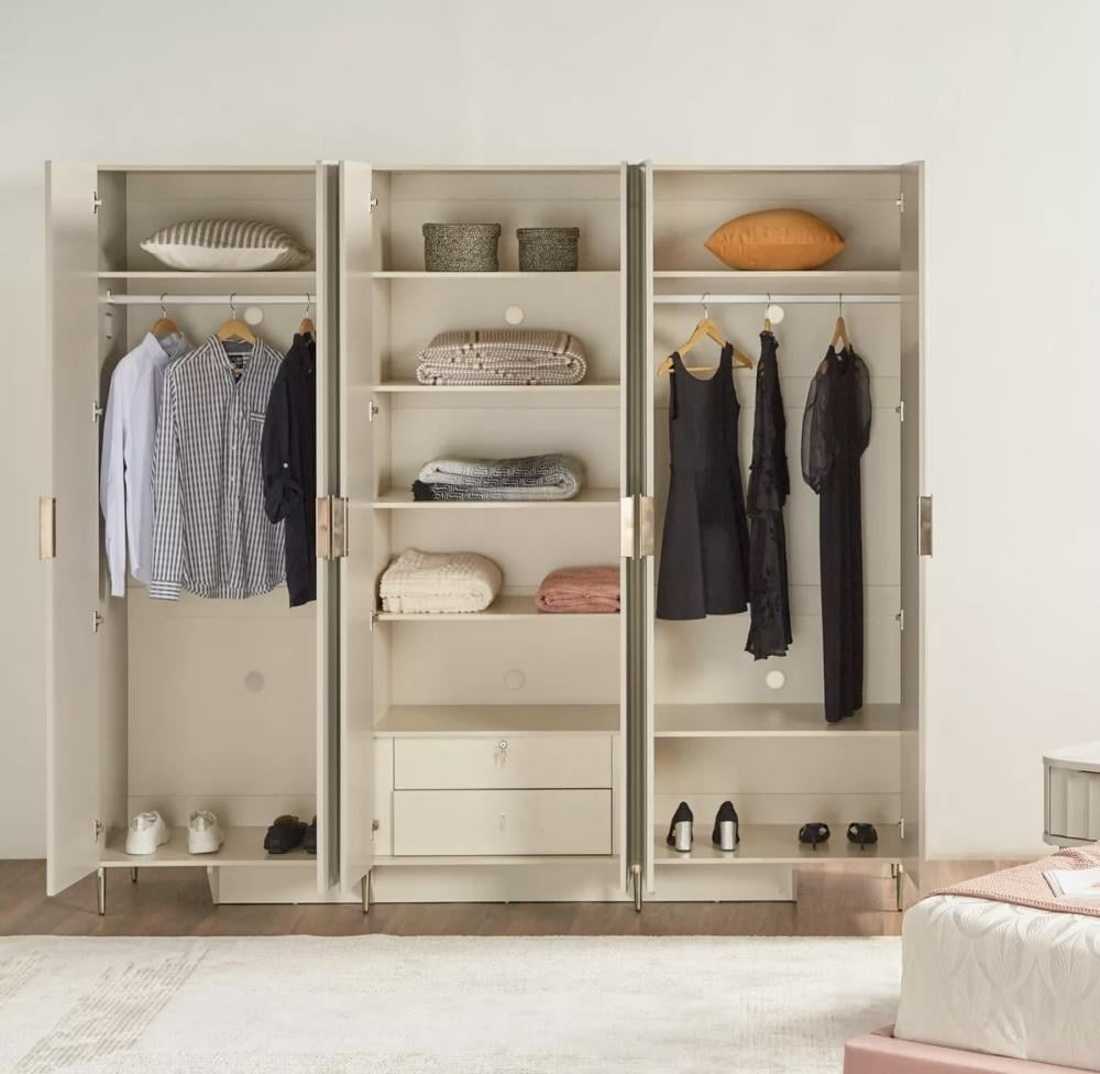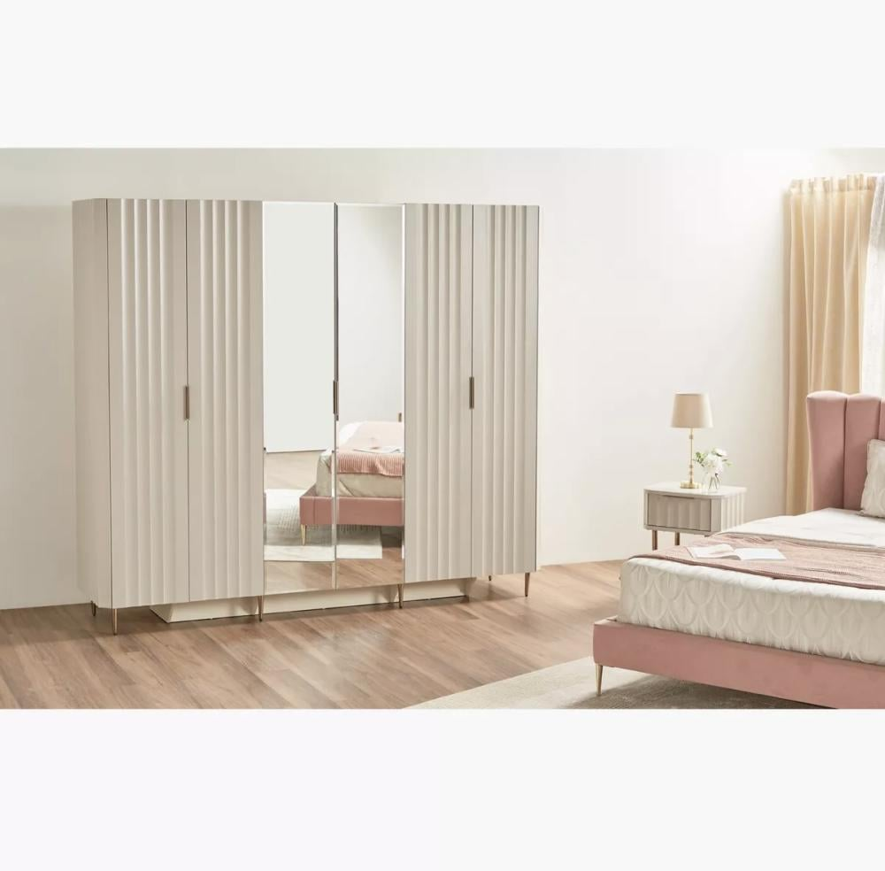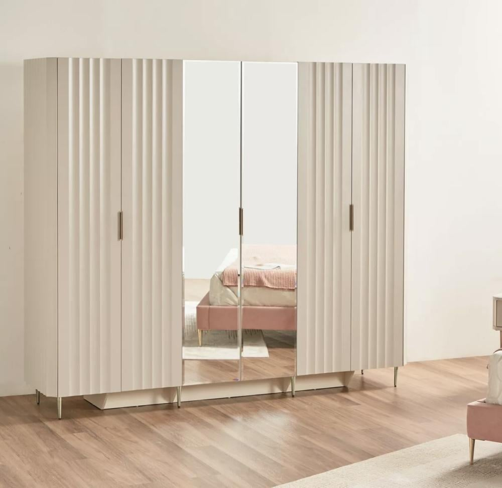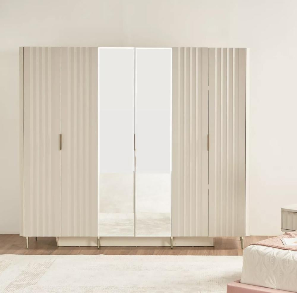 Description: Ripple Wardrobe – 6 Doors with Drawers. A simple and practical design, suitable for everyday use and complements most home décor styles. Specifications: – Materials: Wood + Fabric – Width: 250.5 cm – Depth: 55.6 cm – Height: 220 cm. Care: Gently clean with a soft cloth and avoid harsh chemicals.