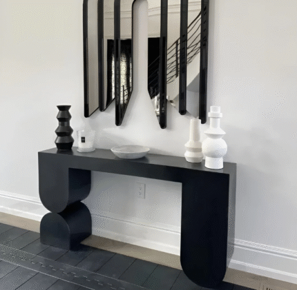 الوصف: كونسول مودرن أسود بتصميم راقٍ بتصميم بسيط وعملي، يناسب الاستخدام اليومي ويضبط مع أغلب ديكورات البيت. المواصفات: – الخامات: