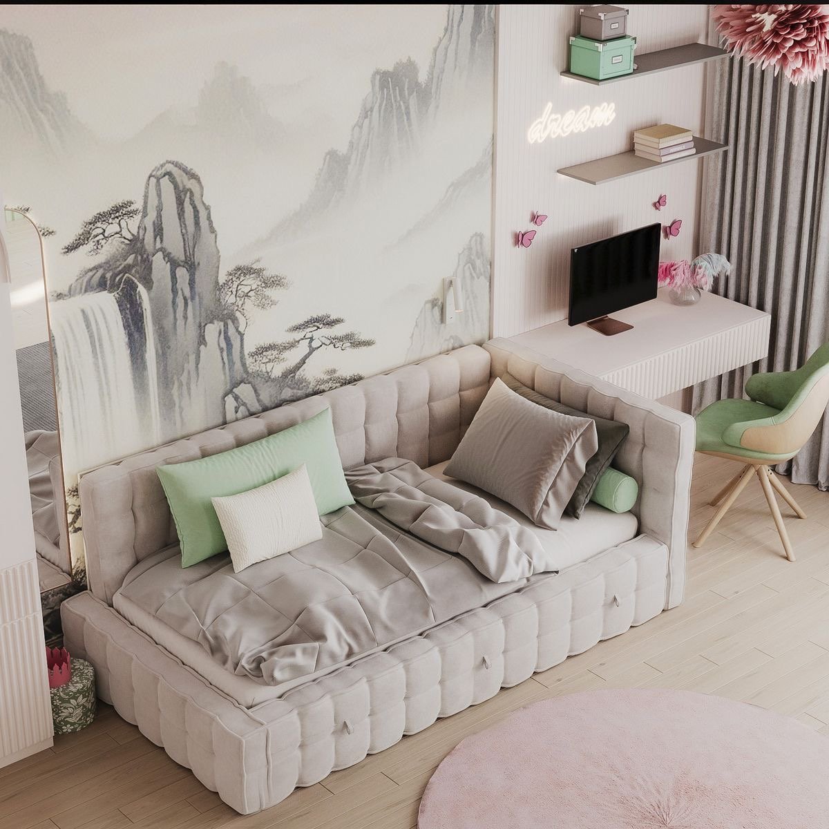 الوصف: سرير غفوة مخمل بيج بتصميم بسيط وعملي، يناسب الاستخدام اليومي ويضبط مع أغلب ديكورات البيت.