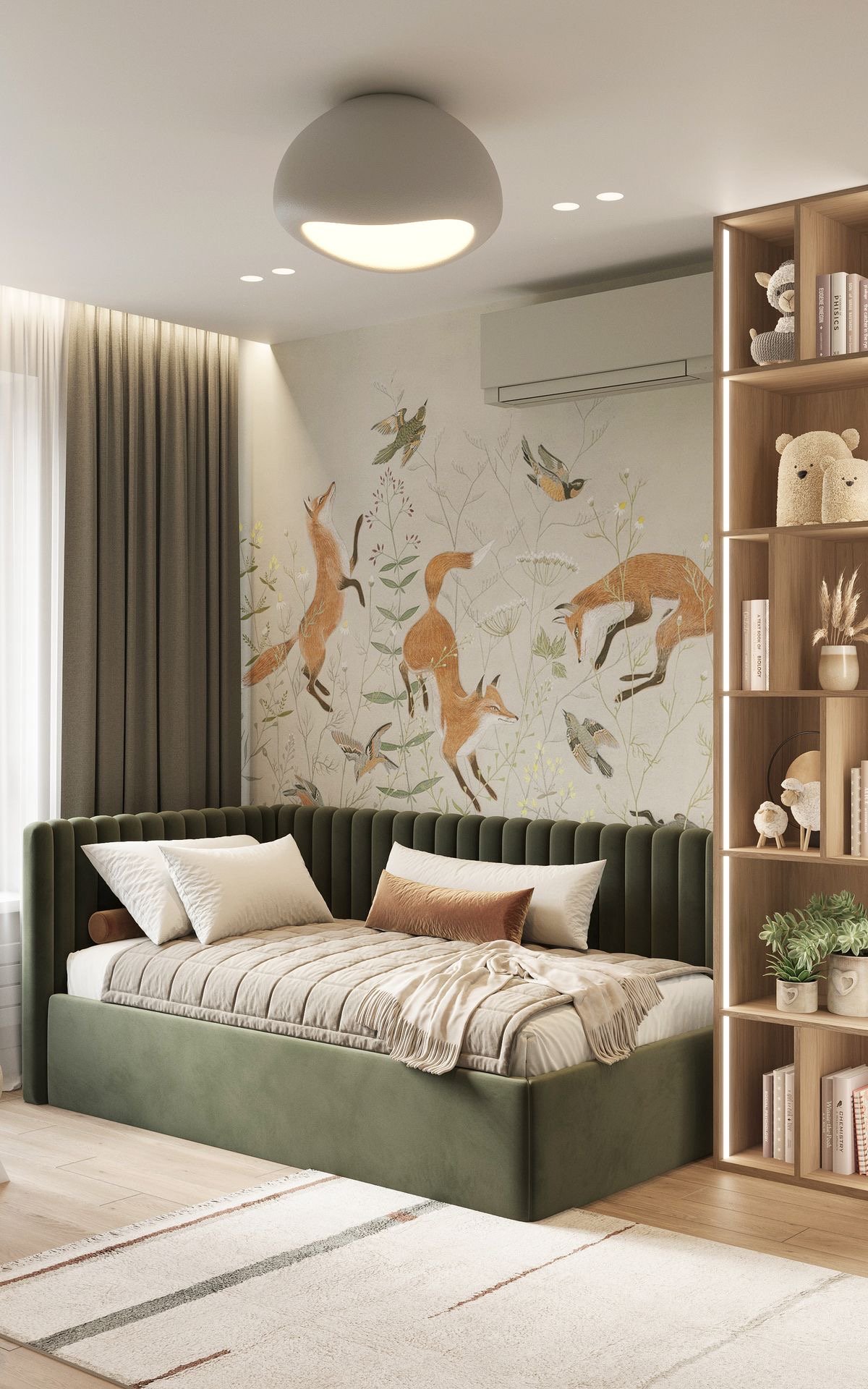 الوصف: سرير منامة مخمل أخضر بتصميم بسيط وعملي، يناسب الاستخدام اليومي ويضبط مع أغلب ديكورات البيت.