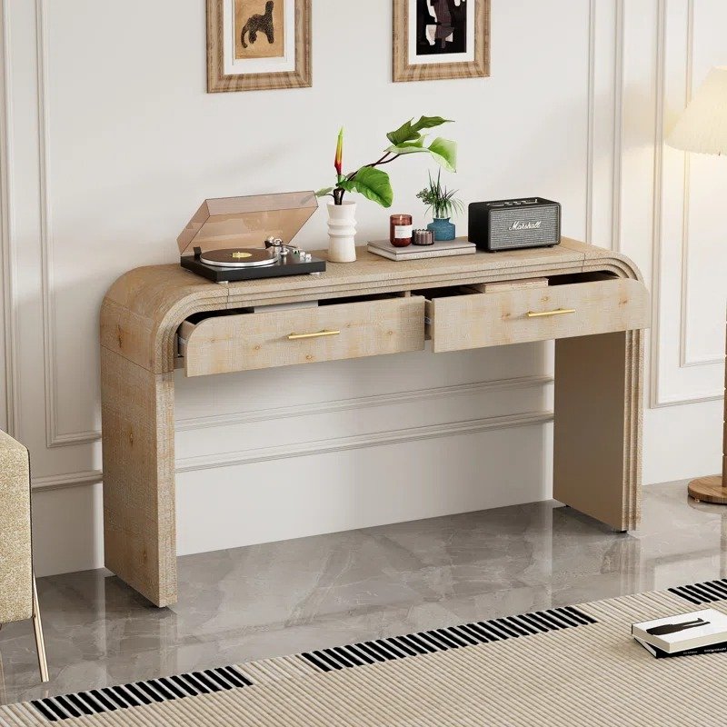 استحضري أناقة الماضي بلمسة عصرية مع طاولة كونسول خشب ذات الطراز الريترو الجذاب، المصممة لتكمل جمال الديكورات الحديثة والتقليدية على حد سواء. تتميز بحواف منحنية ناعمة وخطوط مضلعة (Fluted) تمنحها طابعاً زمنياً أنيقاً، بينما يضيف التشطيب المعتق لمسة ريفية مليئة بالشخصية. لا تقتصر روعتها على الشكل فحسب، بل توفر حلاً عملياً للتخزين من خلال درجين واسعين مزودين بمقابض ذهبية لامعة وسكك معدنية سلسة، لتخزين مقتنياتك والحفاظ على مدخل منزلك مرتباً وجذاباً.
